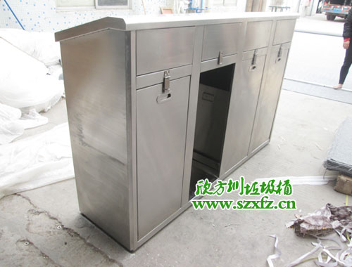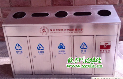 深圳師范學院附屬中學款式的C170五分類環(huán)保回收箱規(guī)格為:1600*400*860mm.外表是一款全新不銹鋼材質打造而成.不銹鋼垃圾桶頂部有五個垃圾投放組合,圓形垃圾投口分別左,右,中間,還有兩個半圓在中間部位。不銹鋼垃圾桶正面開有五個門,每一個門前都有一個小鑰匙配套開門。正面中間橫幅有LOGO的標準,還有深圳大學師范學院附屬中學字樣及英文拼音字母組合而成。不銹鋼垃圾桶五個取放垃圾內膽正門,絲印有五個垃圾投放標志。從左到右依次回收塑料罐,金屬罐,利樂包,紙張,有害垃圾及標志。不銹鋼垃圾桶外觀為方形,具有獨特的堅固耐用,不易破損;耐火安全,抗高低溫等優(yōu)勢。適合各大院校,高檔場所使用。