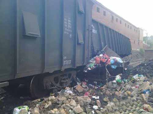 今天早晨 ,雙鴨山中心站至六號線黑龍江北辰公司附近,貨運火車撞到垃圾箱上,可能垃圾箱離火車道太近。沒有人員受傷,但是火車車廂受損變形,垃圾箱變形嚴重!
