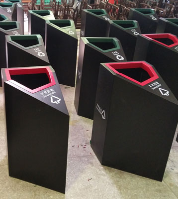 • 產品材質:鋼板噴塑分類垃圾桶采用優質冷軋鋼經除油-除銹-表調-磷化處理后,表面采用汽車靜電粉末噴漆工藝,噴塑粉主要有丙烯酸粉末、聚酯粉末等。雙層防銹,漆面色澤耐久;
